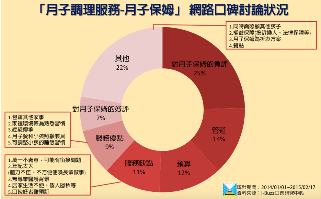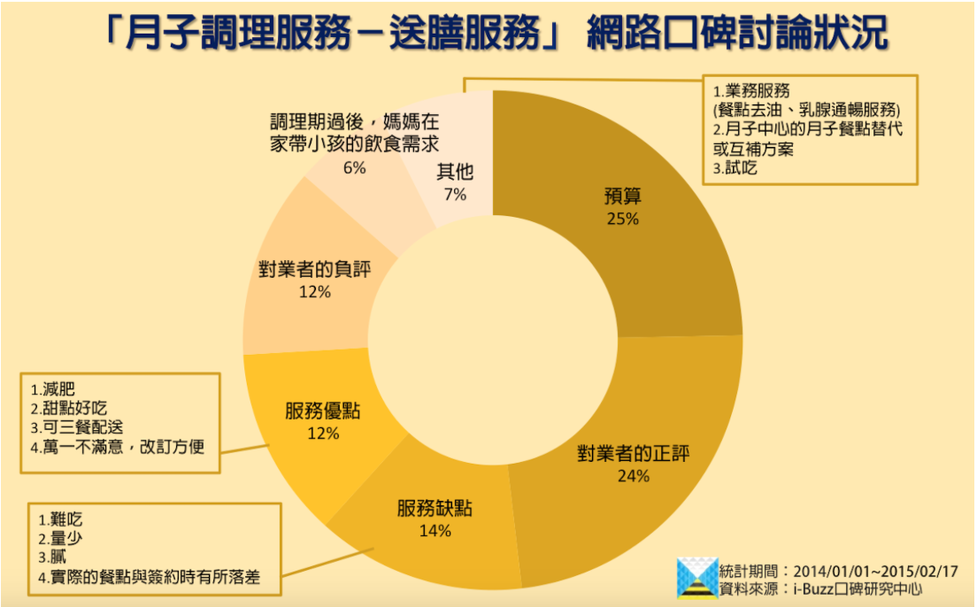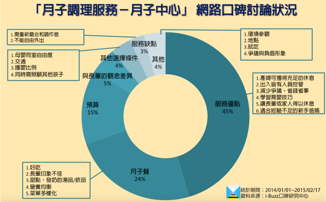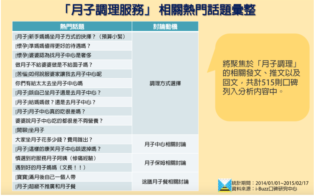 (2015-07-17)i-Buzz上週分享了「月子調理服務」的網路討論狀況,本週進一步篩選其中發文與回文較為豐富、且切合調理服務主題的熱門話題,為大家揭密更聚焦於月子調理的發文動機。