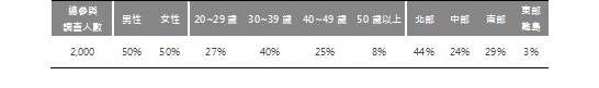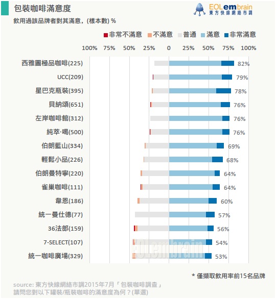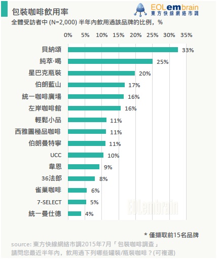以上調查乃根據 EOLembrain 東方快線網絡市調於2015年7月針對市調會員(Panel)所進行的「包裝咖啡調查」而得,共有來自全台灣北、中、南、東部等地區縣市、不同年齡、性別的市調會員參與本次網路調查,樣本組成如下: