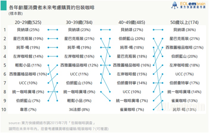 然而有一些品牌可看見在年齡上不同的偏好,例如台灣罐裝咖啡的經典品牌「伯朗藍山」,特別受到40歲以上族群的青睞;另外飲用率相當高的「純萃.喝」在50歲以下族群較受歡迎。
