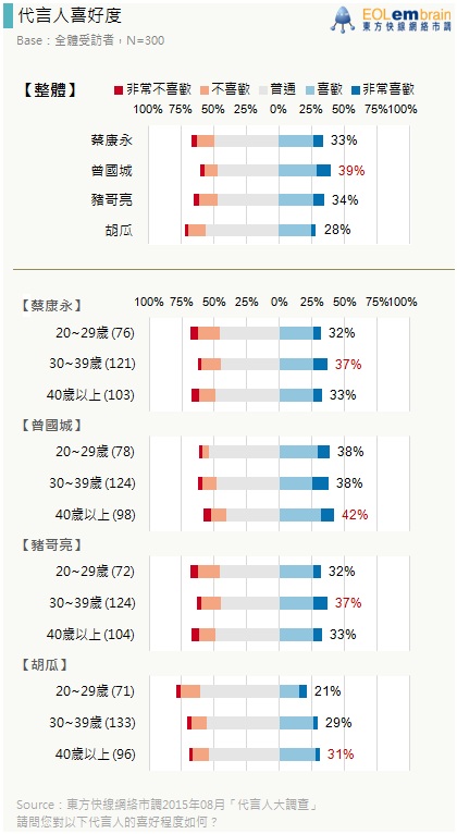進一步分析四位代言人在各年齡層的喜好度的情況,發現曾國城與胡瓜則較受到40歲以上受訪者的喜愛;而蔡康永與豬哥亮較受到30~39歲年齡層的青睞。