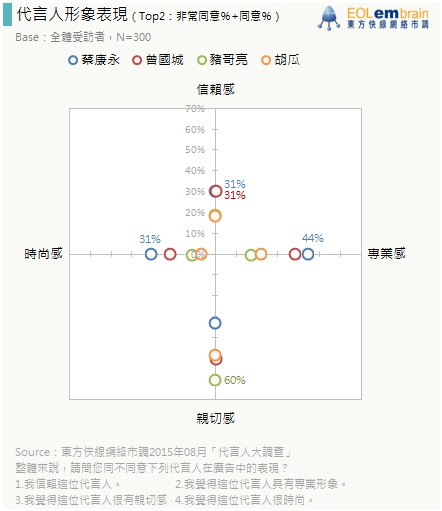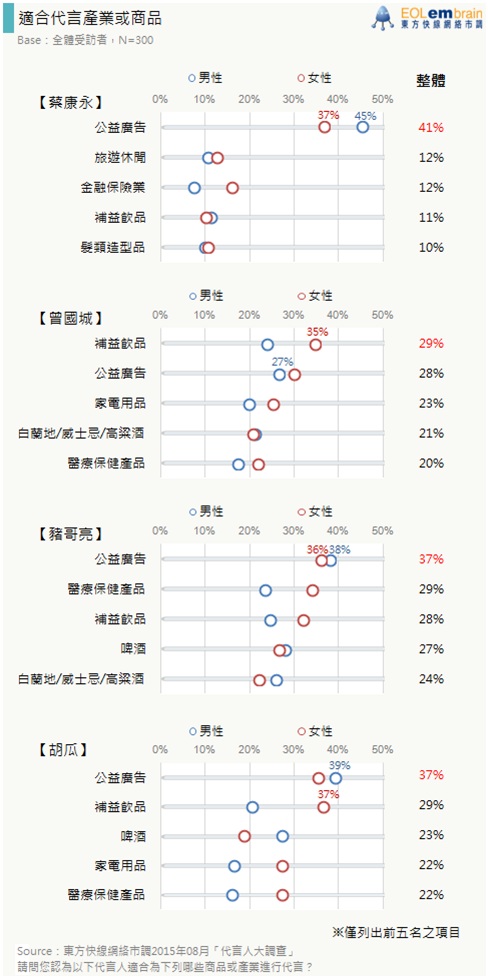 (2015-09-08)本次調查分別針對目前當紅四位綜藝節目主持人進行比較,期望瞭解在喜好度、代言形象與適合代言項目的差異性。