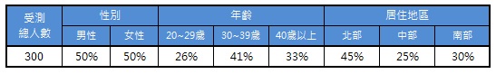 以上調查乃根據 EOLembrain 東方快線網絡市調於2015年08月針對東方快線網絡市調會員所進行的「代言人大調查」而得,共有來自全台灣北、中、南部等地區縣市、不同年齡、性別的市調會員參與本次網路調查,樣本組成如下: