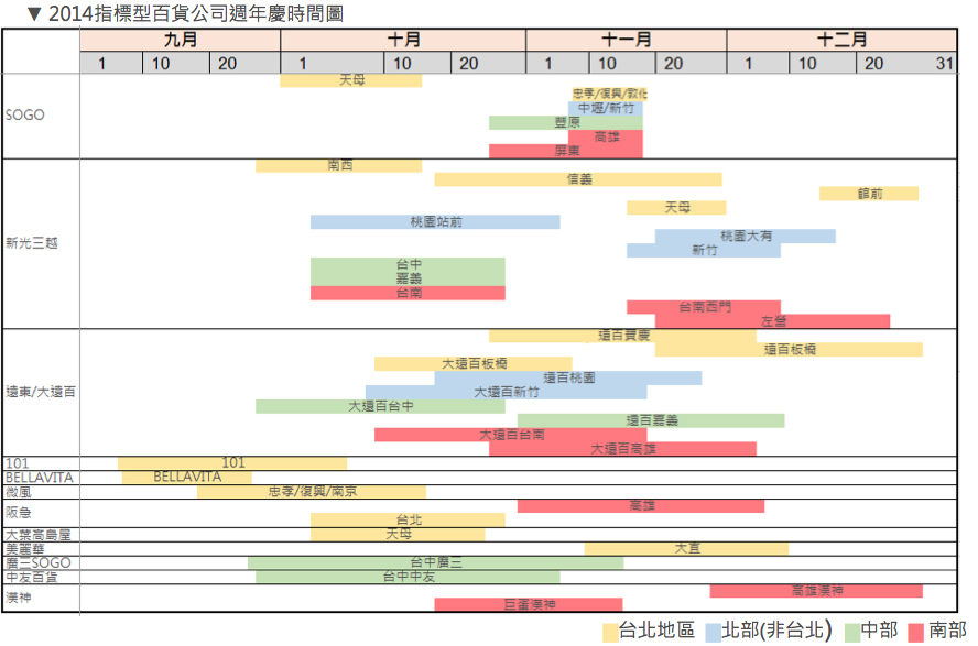 2014年8月底由微風廣場預購會啟動週年慶前哨戰;而微風、101等這些率先舉辦週年慶的精品百貨,主打名品珠寶等高價品,專櫃美妝非行銷重點。目標一般消費者、主打美妝特惠的百貨週年慶時間多集中在10~12月。