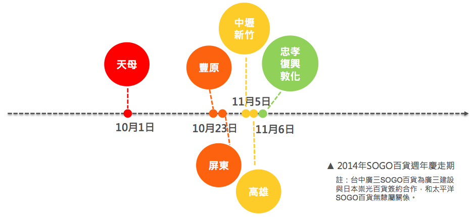 SOGO 百貨除了天母店,其餘分店全集中在10月底至11月中旬舉辦,而重點壓軸忠孝、復興、 敦化三大分店多年來堅持只有12天的檔期,用短期且精準的商品行銷創造高業績,2014年週年慶首日即吸引十萬人次,創下8.5億元的亮眼成績。