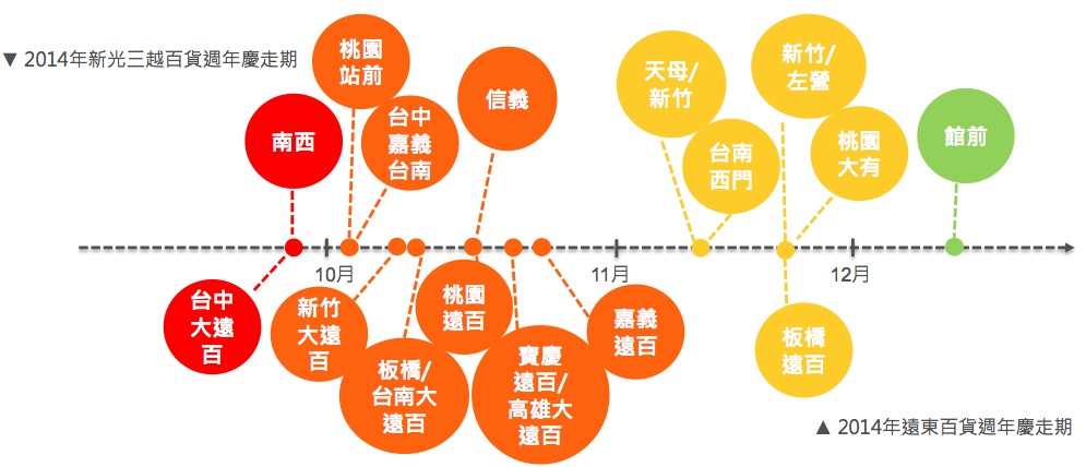遠東/大遠百百貨公司週年慶時程前後長達三個月,各分店週年慶檔期也近一個月,並結合 HAPPY GO 卡集點消費抽汽車活動,鼓勵消費並增進辦卡數。