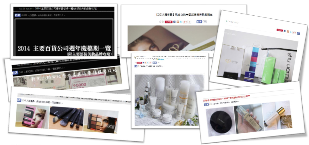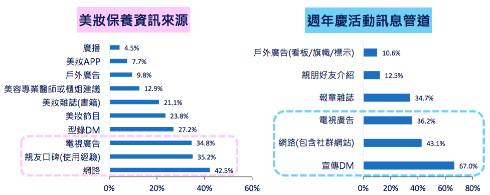 據全國意象調查指出,週年慶的活動訊息主要來自各家百貨公司 DM,其次是網路和電視廣告。美妝保養資訊來源以電視(電視廣告、美妝節目)佔大宗,其次是網路和親友口碑介紹。網路管道來源主要是部落客介紹/分享/推薦文,以及美妝網站。