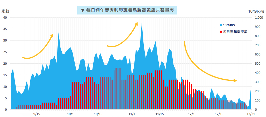 從2014年週年慶期間表現來看,進入10月週年慶熱潮期前,專櫃品牌的電視廣告在9月便已如火如荼地開打,特別是10月之前的兩週,廣告聲量不斷升高。