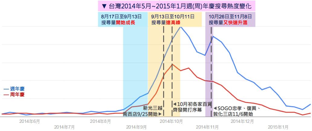 消費者對週年慶的關注自9月初台北101購物中心開打以後開始逐漸提升,至10月初全台超過十家百貨公司齊發展開週年慶,讓搜尋熱門度達到最高峰。