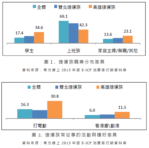 就東方線上 E-ICP 消費者行銷資料庫也可以發現,目前高雄捷運族的特性,有著以學生族群為主、對所謂ACG(動畫、漫畫、遊戲)的高度偏好等趨勢。