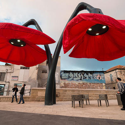 「warde」位於以色列首都耶路撒冷市中心 Vallero 廣場的人行道上,由於周圍都是相對較低矮的房子,所以遠遠就能看到它的身影,結合了動態感應以及灌氣裝置,當偵測到有明顯的動態,例如有人走過,或者電車經過時,埋在底部的裝置就會啟動送風,將空氣灌入頂部的紅色傘布,展開成直徑九公尺巨型花傘。
