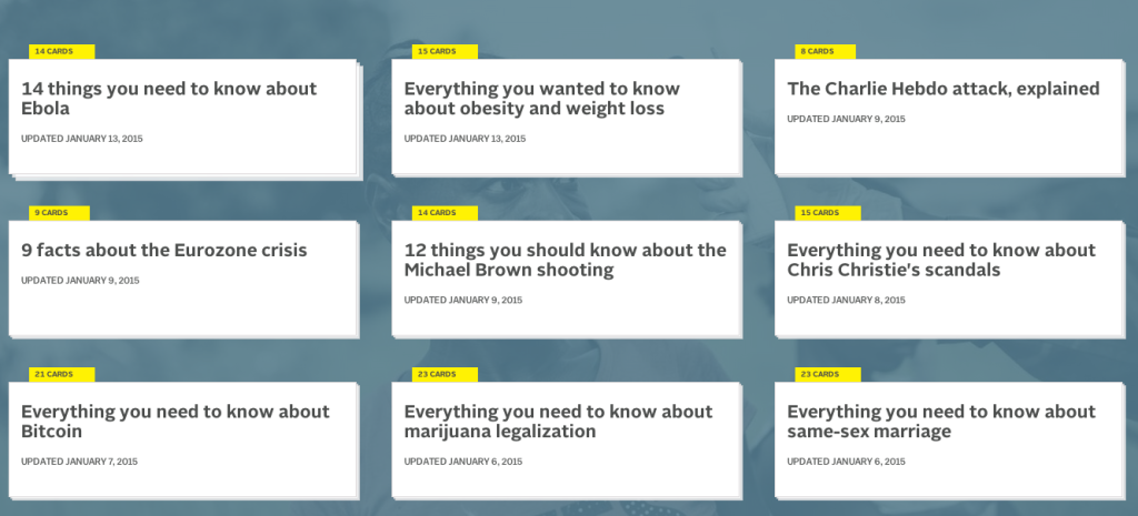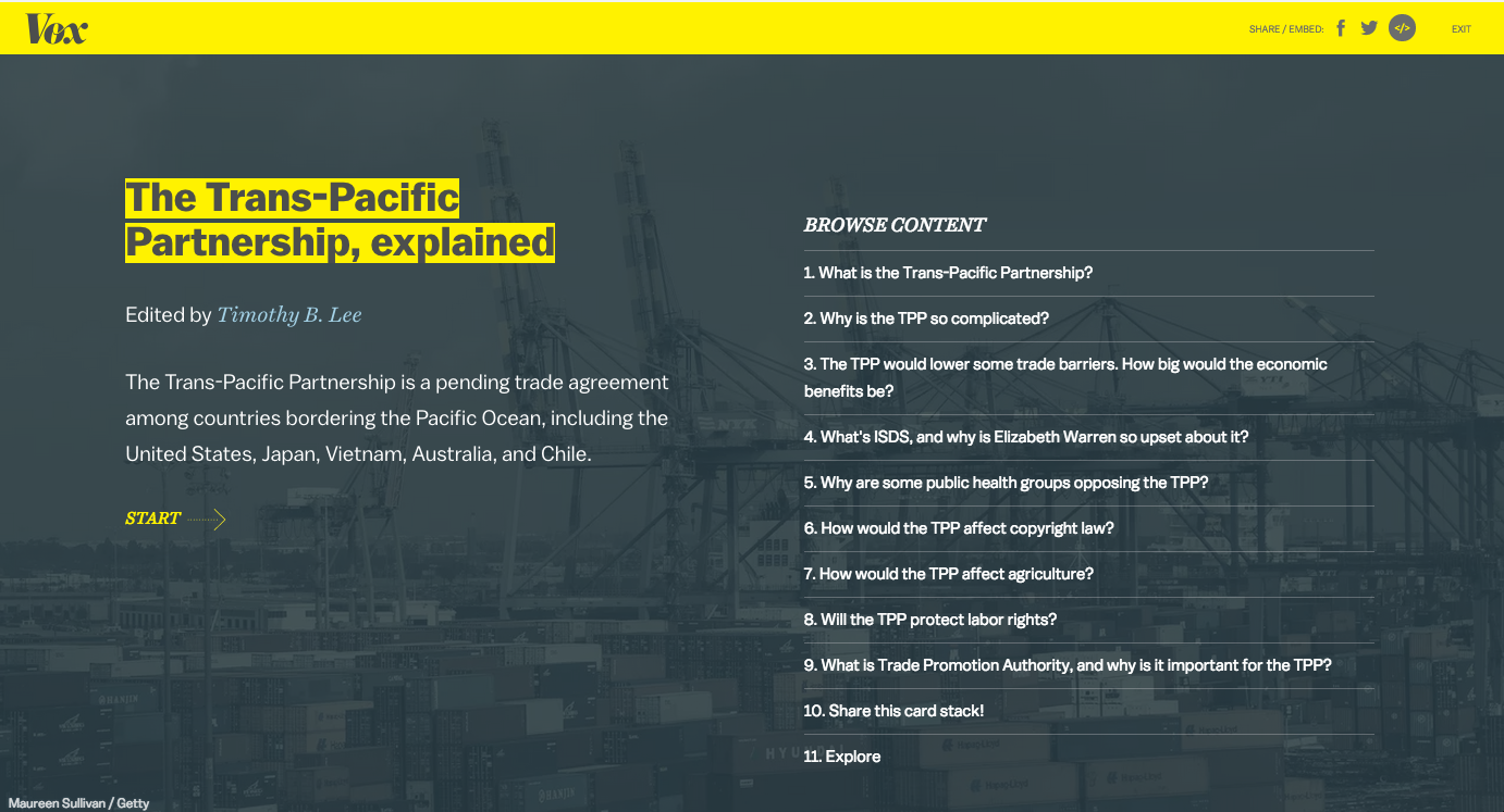 Vox.com 是 Vox Media 數位媒體集團旗下的新聞網站,集團共有8個網站,分技術、遊戲、生活、運動多種類別,每月的獨立訪客,美國為8,600萬、全球為1億1,000萬,為大型數位媒體。Vox.com 的最大特點在用「卡片疊」(Card Stacks) 的方式講故事如下圖(可點選放大)。