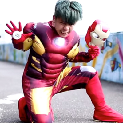 圖為網路名人蔡阿嘎在【十秒看完復仇者聯盟2】影片中飾演鋼鐵人一角