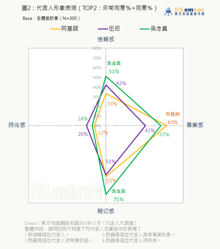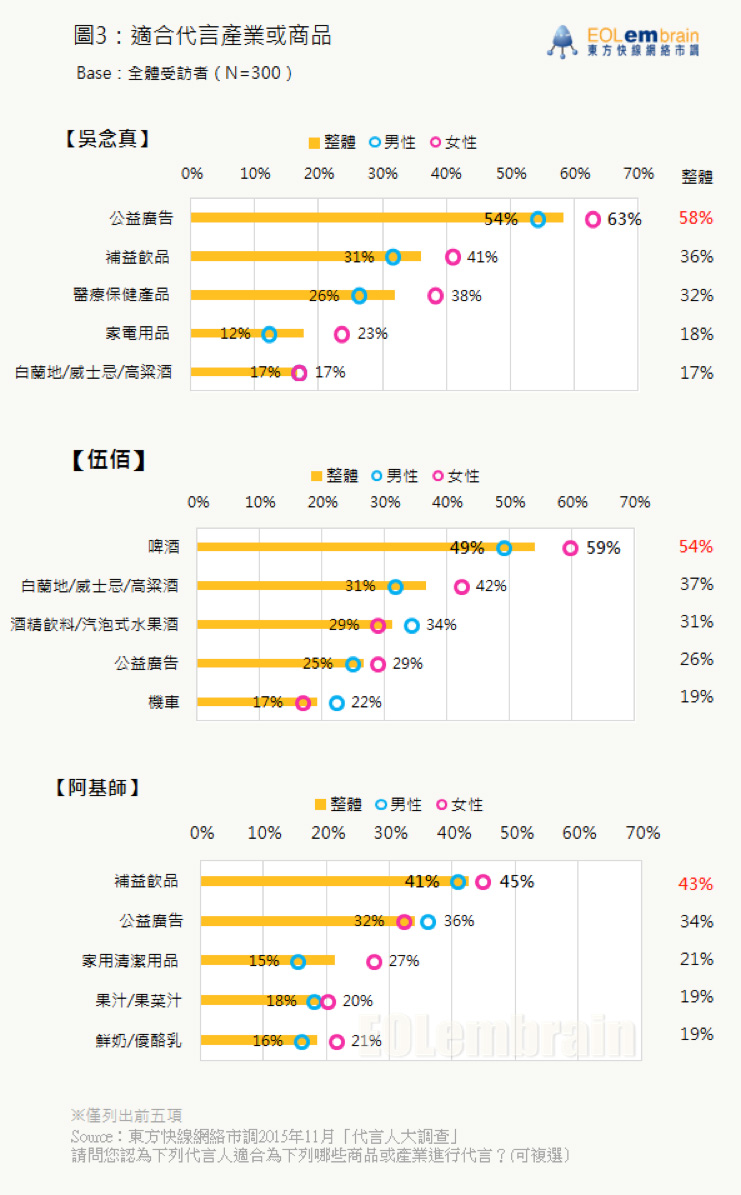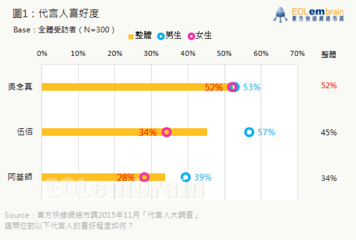 因此,EOLembrain東方快線於2015年11月份進行一項「代言人大調查」,挑選三位具有本土在地形象的代言人─伍佰、阿基師、吳念真,本次調查結果如下: