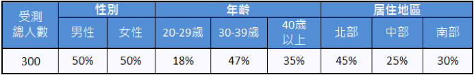 以上調查乃根據EOLembrain東方快線網絡市調於2015年11月對市調會員(Panel)所進行的「代言人大調查」而得,共有來自全台灣北、中、南部等地區縣市、不同年齡、性別的市調會員參與本次網路調查,樣本組成如下: