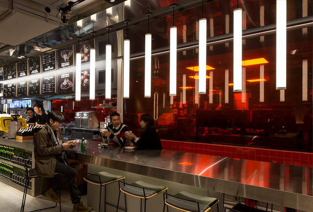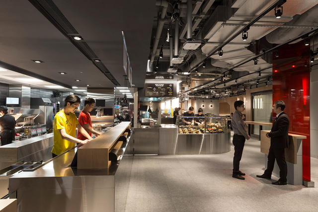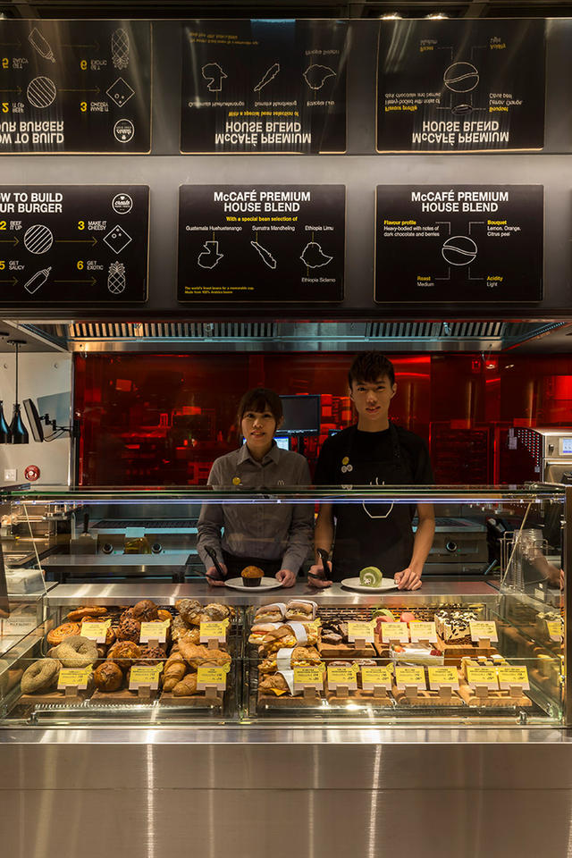 設計團隊把餐廳的內部裝潢、廚房的配置、牆壁上的插畫、產品包裝和員工制服,全都大手一揮,重新改造。其中,變化最大的應該就屬廚房了,從原本的封閉式的廚房轉為半開放式的烹飪區,從煎、煮、炸、烤、包裝等餐點準備全流程,全都暴露在消費者赤裸裸的目光下,僅有少數該藏身幕後的地方,老老實實的躲在人群之後。