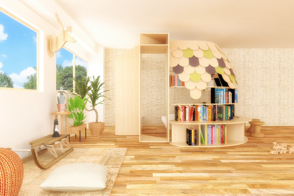 最後則是多功能空間 Urokoya,由於占地面積較大,因此實用度偏低,畢竟如果家裡空間足夠的話,應該就能直接隔出一個房間,而不用將就於這種「家中家」的隔間方式,但卻也因為 Urokoya 在空間運用上較為充裕,因此能給予設計師最多地方發揮設計巧思。
