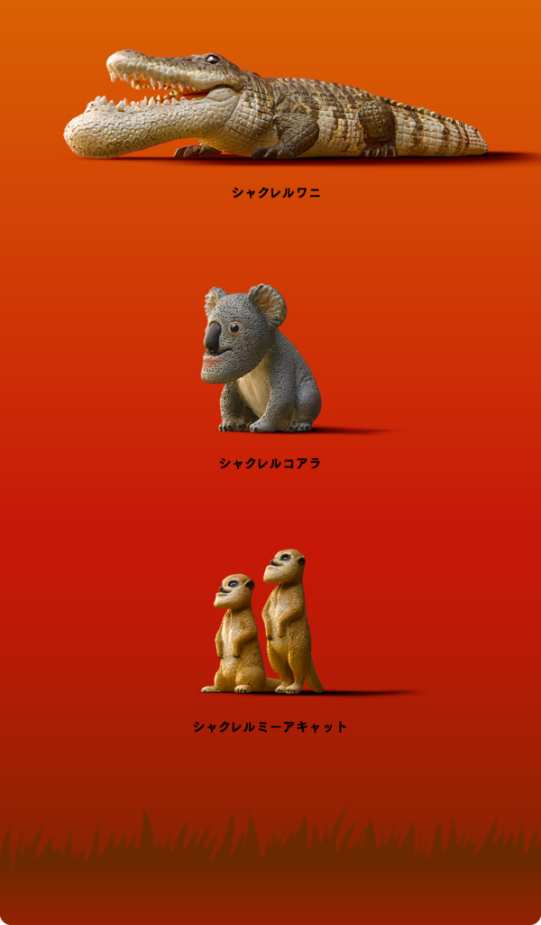一群長著戽斗的動物們精神抖擻地站在夕陽下,牠們望著遠方,眼神驕傲而明亮,彷彿未來充滿希望,但凸出的厚下巴卻讓人忍不住噗ㄘ一笑,徹底展現 Takara Tomy 的惡搞精神!