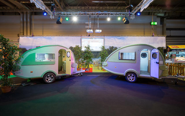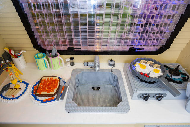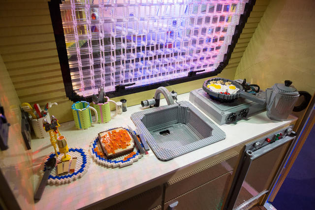 這台淚滴型露營車是為了慶祝休閒用露營車130年周年生日快樂所組裝的,從外觀到內裝,全都按照露營車的尺寸打造,舉凡露營車中常見的配備,像是水槽、電燈、桌椅、床鋪、冰箱,甚至是冰箱裡的食物、平底鍋裡的荷包蛋、桌上的西洋棋,一個都沒有少,就連水龍頭打開都有自來水,只差沒有裝上引擎,申請車牌,開上路來趟真正的露營之旅。