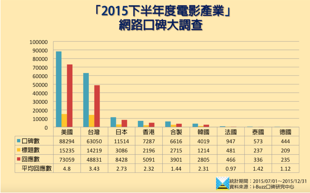 台灣電影相關口碑的平均回應數亦有3.43筆,與日本的2.73筆、香港的2.32筆與韓國的2.31筆三國相比較,回應數十分高。排行第六的韓國電影,口碑數雖不多,但平均回應數堪比香港電影,討論的熱絡程度值得注意。