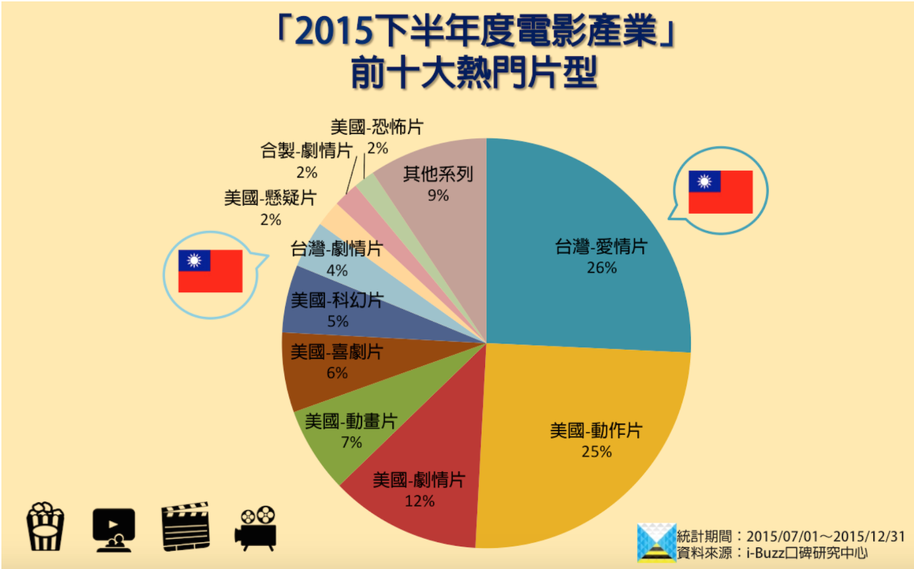 有趣的是,儘管美國電影的整體口碑占比最大,但2015下半年度的最熱門電影類型,卻是台灣愛情片。