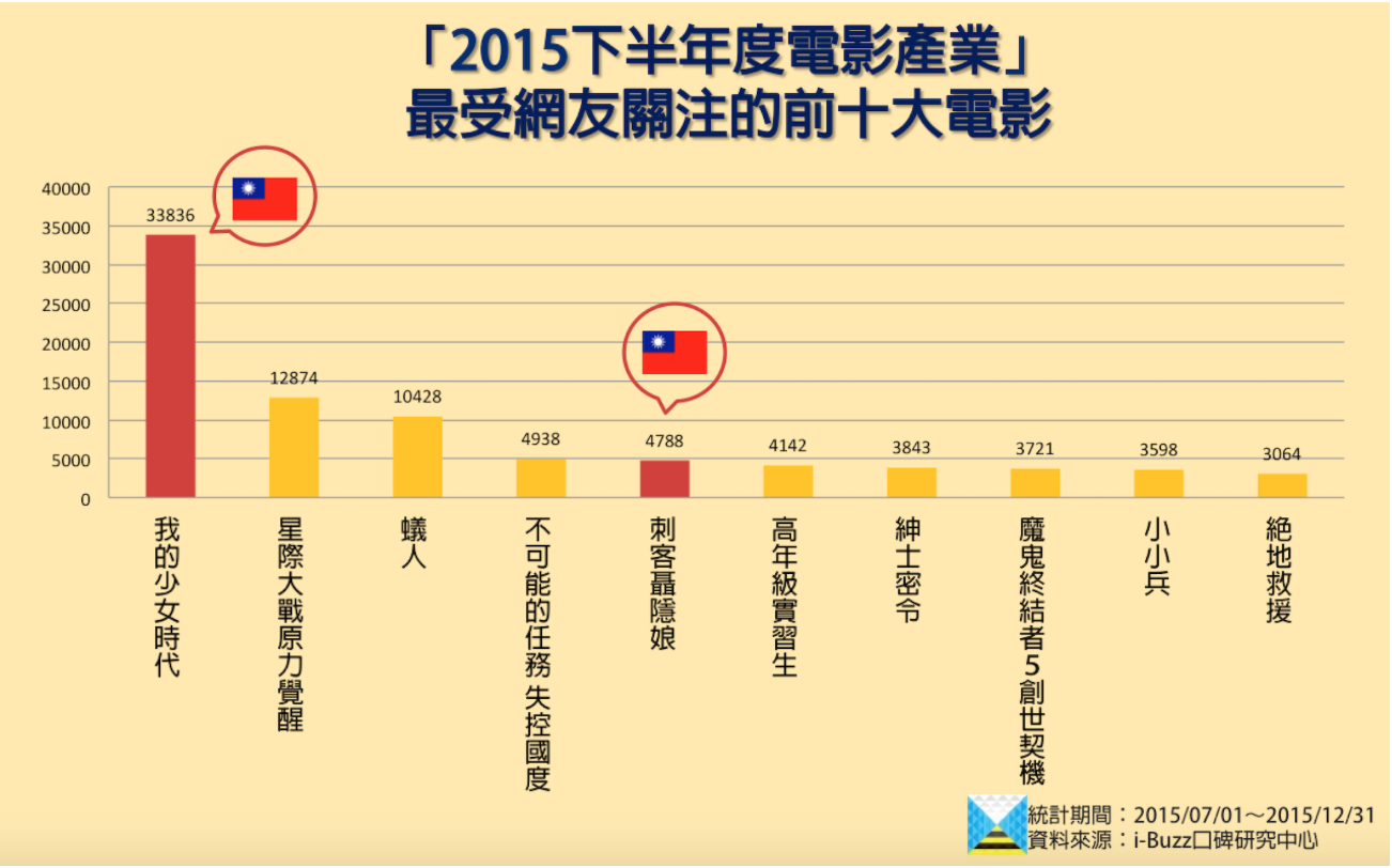 綜觀台灣電影產業的下半年度數據報告,口碑量最大者為「我的少女時代」。且因此片熱賣,也連帶拉抬起「台灣–愛情片」的口碑數,成為下半年最強電影類型,強壓以往的美國主流片。