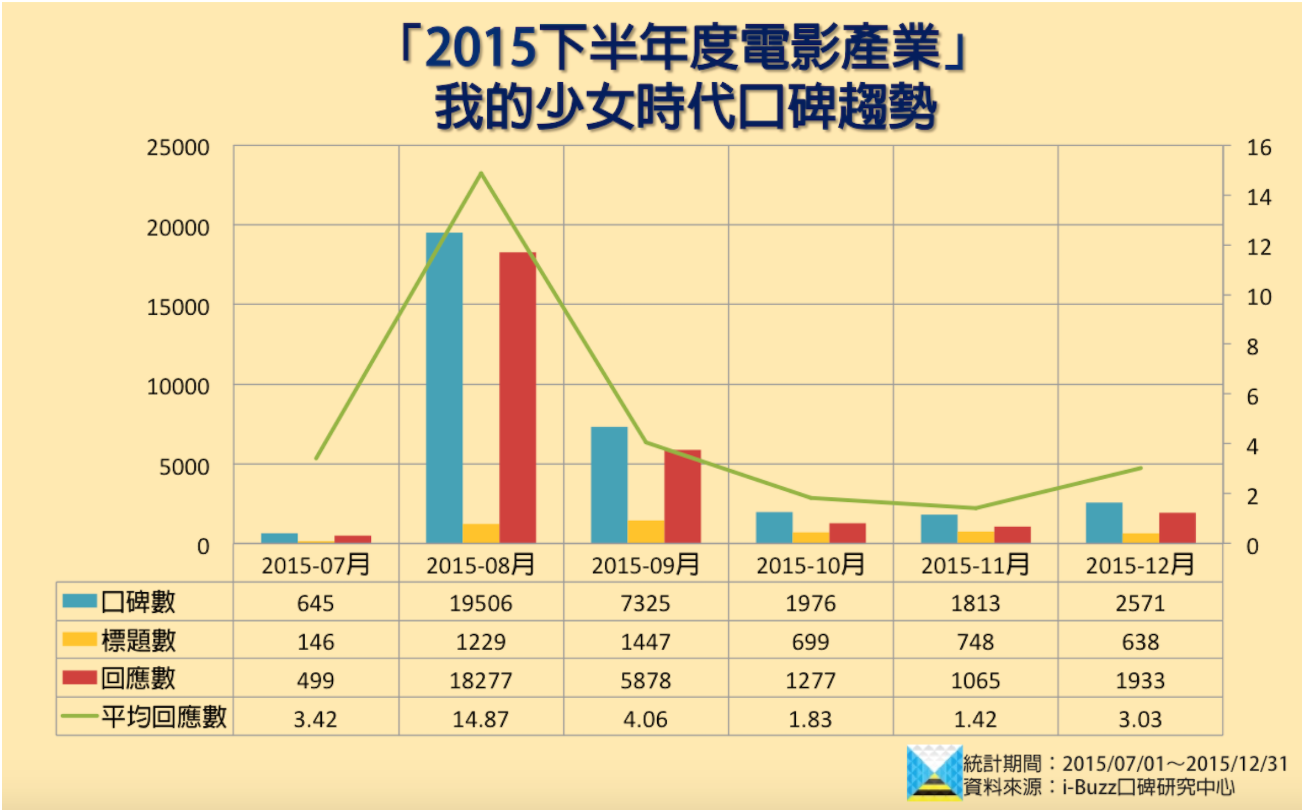 該片於8月上映時,短短一個月間便取得近2萬筆口碑數,平均回應數14.87筆更是驚人。如檢視下表10到12月的口碑數,可發現在上映兩個月後,「我的少女時代」仍有破2,000筆的月平均口碑數。
