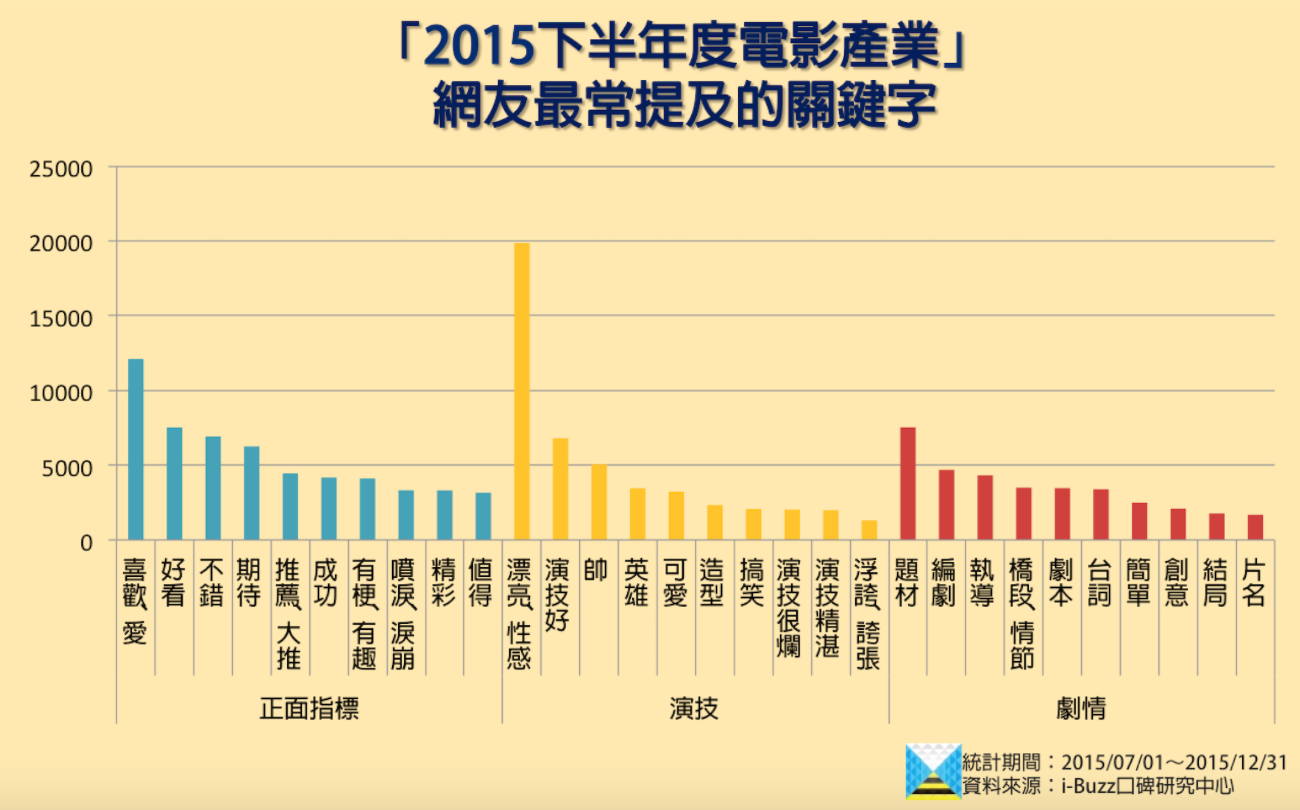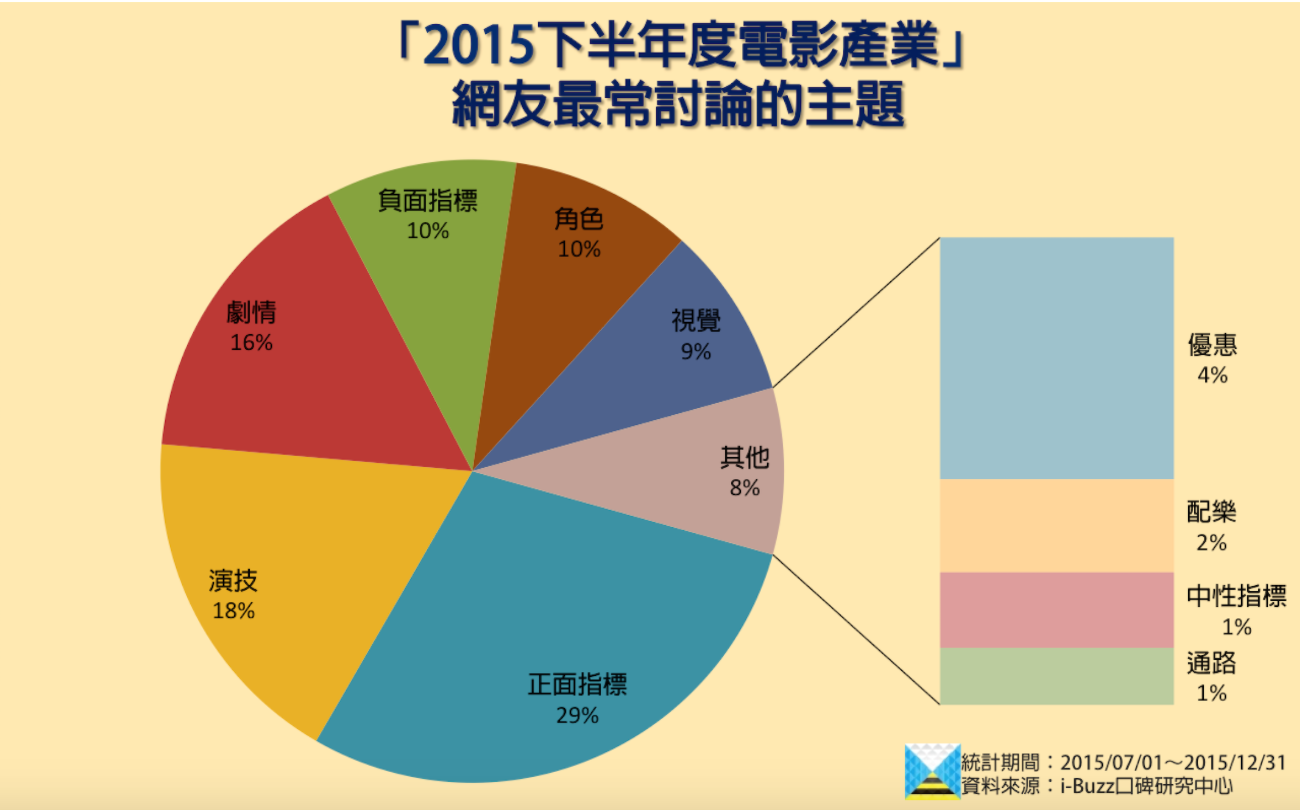 i-Buzz口碑研究中心監測了2015年7月至12月的電影口碑數據,除追蹤電影類型、出品國、熱門討論焦點等面向之外,亦追蹤了74部熱門電影的口碑數據。希望能藉由電影產業的走向分析,了解網友對電影的喜好與關注重點。