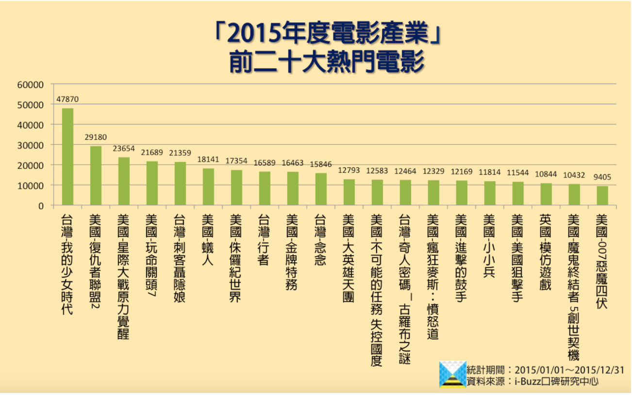 不過,自從國片復興之後,台灣電影票房已經不再被好萊塢包辦了;從網路口碑也可看出國片還是台灣觀影民眾的討論重點,例如去年引起熱議、票房成績開出紅盤的「我的少女時代」,網路聲量高居排行榜第一,擁有超過4萬7千筆口碑數,遠超過第二名好萊塢賣座片「復仇者聯盟2」。