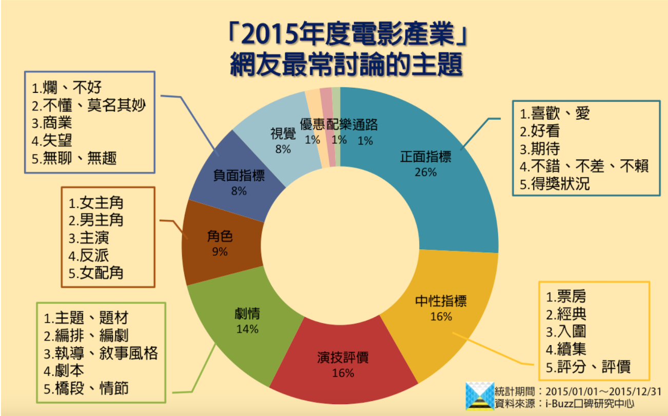 在迎接新的一年即將陸續上映的各式各樣電影之前,i-Buzz口碑研究中心分析了過去一年78萬多則與電影有關的網路口碑,帶您一窺2015年度電影口碑的話題趨勢。