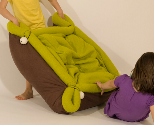 使用者透過4個木製掛球穿梭在各個圓孔之間,改變 Blandito 的形狀,或者攤開來成為床墊,供孩子們在上頭翻滾、玩耍,或者綑成舒服的睡袋,和另一半安穩的睡個午覺,或者立起來變成懶骨頭或躺椅,坐在上頭喝杯茶、看本書,放個空都不成問題。