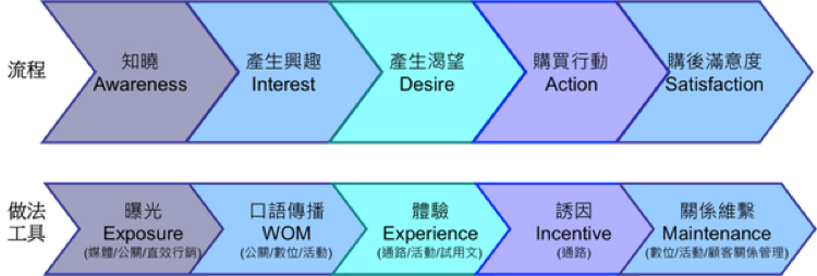雖然數位時代的傳播,有的專家學者提出「AISAS」的論述,但筆者認為,行銷溝通的目的是陪著消費者從認識產品到購買,因此,AIDAS(也有說是AIDMA)的消費者購買流程從來沒有變過,而行銷溝通就該依著消費者的購買流程而推廣。
