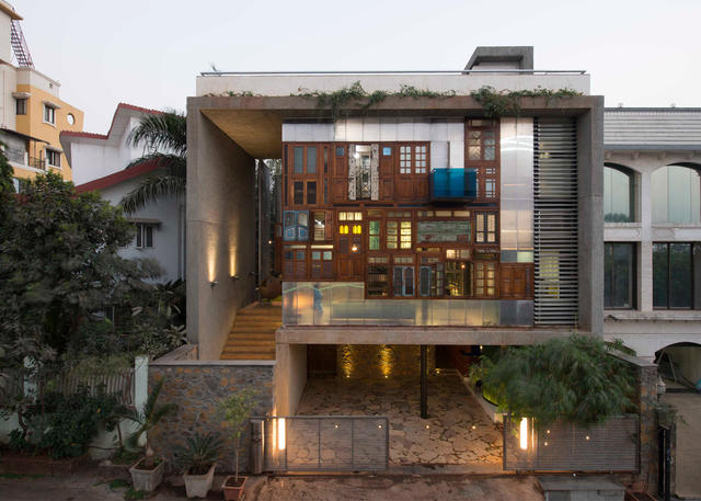 Collage House 走著傳統印度式的建築風格,怎麼說呢?因為就好像當地居民回收、再利用的習慣一樣,建築團隊在設計中,也大量使用回收材料,使得外觀上充滿了補釘和拼貼。