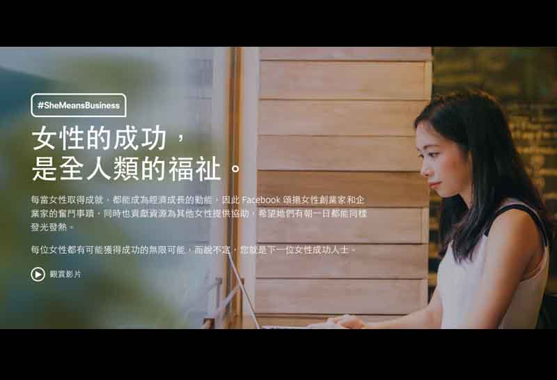 Facebook在台灣舉辦 SheMeansBusiness女性創業家論壇,支持及幫助台灣女性創業家。SheMeansBusiness提供一系列的工作坊、訓練課程及一站式資源中心(https://shemeansbusiness.fb.com/zh/),增強女性創業家的知識、專業技能與技術,甚至拓展人脈,幫助她們在網路上建立並推廣事業。SheMeansBusiness將與業界領袖、民間團體、非政府組織、及地方公部門共同協作運行。