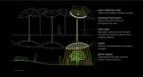 整座地下公園預計佔地一公頃,該計畫和美國太空總署(NASA)的工程師與建築師合作,設置太陽能能源蒐集系統,透過許多如「小耳朵」般的電子設施,運用凹面鏡的原理將地表上的太陽光蒐集起來,並透過光纖電纜引導至地底,同時過濾到有害的紫外線和熱度,只保留植物光合作用所需的波長,以幫助植物生長,並確保地下公園的溫度不會過高。