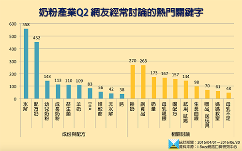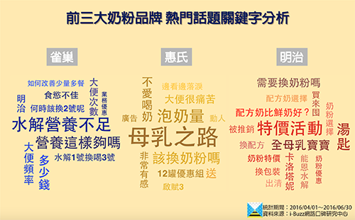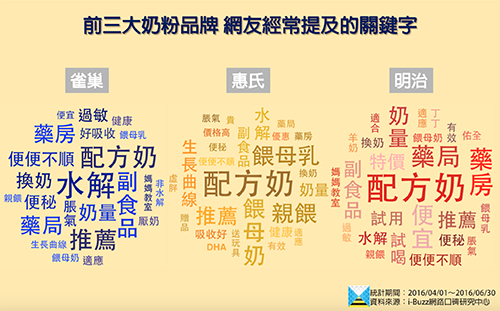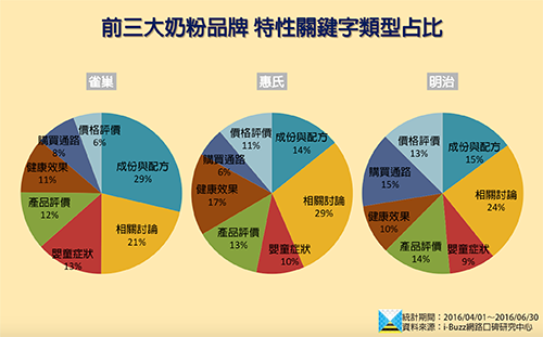 在面對市售這麼多奶粉品牌,各自主打著不同的效果、配方之下,究竟網路上的討論狀況是如何呢?網友最在意的關鍵又有哪些?i-Buzz口碑研究中心透過網路大數據的蒐集與分析,以期能理出2016年第2季奶粉產業的網路口碑現況。