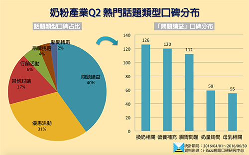 綜觀而論,奶粉產業2016年第2季的口碑概況,整體圍繞著「銜接配方奶或成長奶粉的時機」以及「寶寶的過敏與腸胃便溺」等問題。