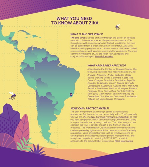 PornHub除了提供免費成人影音內容外,觀眾也能選擇付費成為會員,享有更多內容服務(PornHub Premium)。為了避免茲卡透過性行為傳染,PornHub在奧運期間,讓位於里約當地的所有選手、觀賽民眾,免費成為Premium會員。