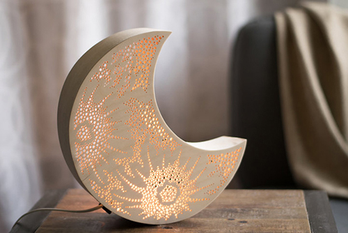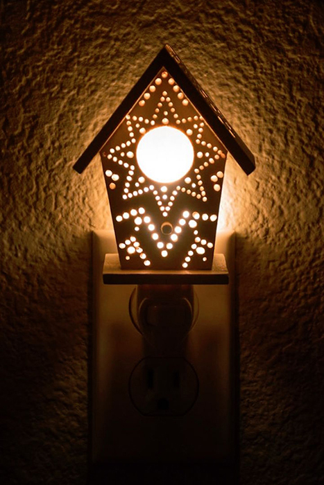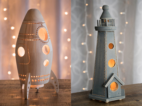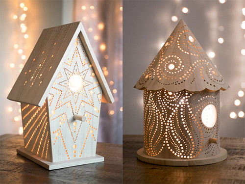 Sara Collet Watson 將絢麗燈光與手工木雕結合,創造出一系列美觀又實用的精緻檯燈。這些火箭、月亮及小屋子,都是經過巧手切割、雕刻並裝飾著一個個細微的洞,滑順的木頭陪襯著溫暖的燈光,讓黑夜充滿童話的氛圍。