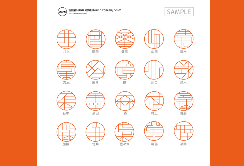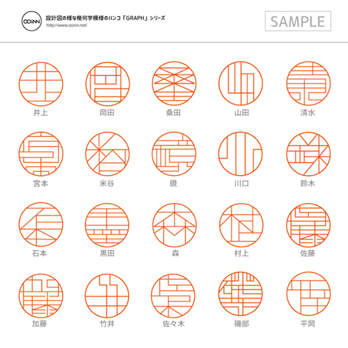 若你是個直腸子的人,或者是對細節相當講究的專業人士,如工程師、數學家的話,這個由直線組成的圖章再適合你不過了!稜稜角角的「圖畫」將漢字之美顯現無遺,每個圈圈內的線條都代表一個日本姓氏,就像光線在萬花筒中不斷反射,最終拼湊出值得細細玩味的文字世界。