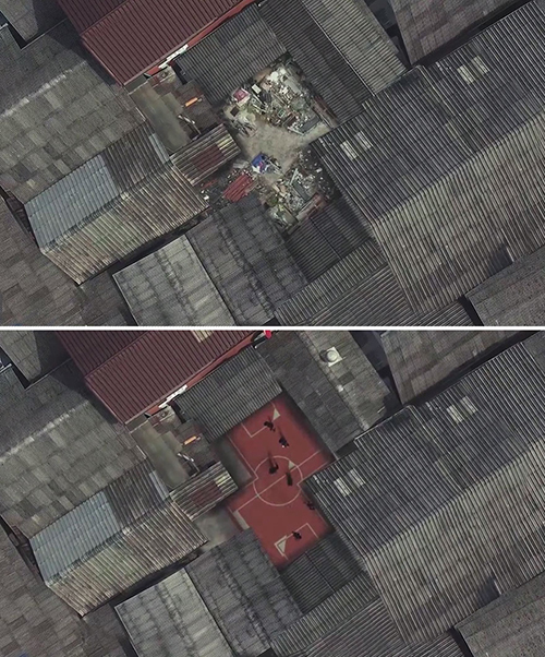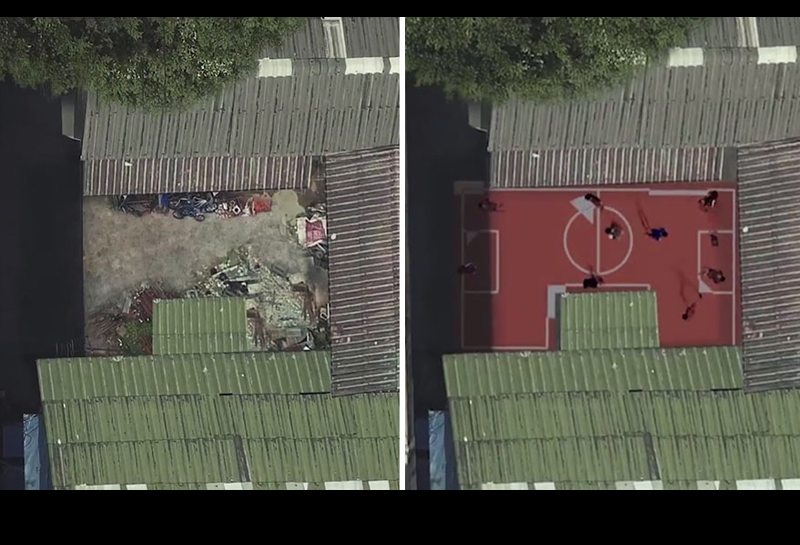 設計團隊挑中的地點,是大樓間的廢棄空地,空地上滿是垃圾,根本沒有人會想到能夠拿來當作球場,但是建築團隊始終堅信著「空間能夠改變一個人生活」,而努力整地,如今看著影片中的球場,充斥著孩子們的笑聲,果然證明了一切努力都是值得的。