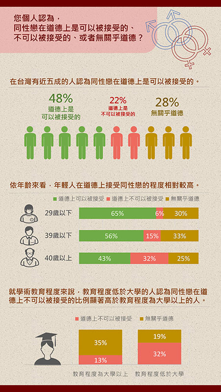 依年齡來看,年輕人的接受程度相對較高,未滿40歲的人有超過半數認為同性戀在道德上是可以被接受的,未滿30歲更是有高達近六成五表示接受。但四十歲以上卻只有約四成表示同性戀在道德上可以被接受。性別來看,女性有52%表示接受,略高於男性的44%。