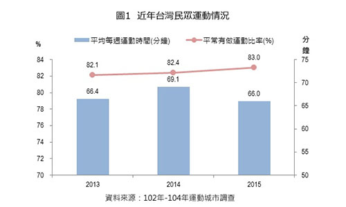 根據教育部「運動城市調查」的統計資料,台灣民眾平常有在做運動的比率超過八成,2015年已提升至83%;在運動時間上,近三年民眾每週平均的時數也都超過一小時。這股「動起來」的趨勢,也可望為市場帶來更多的契機。