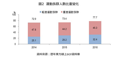 觀察運動人數比重,在整體運動人口的趨勢,與「運動城市調查」的走向一致,都呈現逐步上升的態勢,比重由2014年的72.9%上升至77.7%。細究運動時間差異,可發現重度運動族群比重沒有很大變化;但相對的,輕度運動族群的比率逐年提升,已由2014年的25.1%增加至2016年的32.4%。由上可知,近年台灣運動風潮擴張的動能,主要由輕度運動族群所推動。