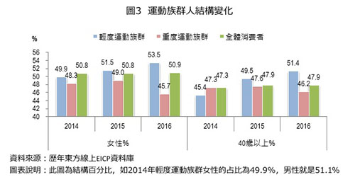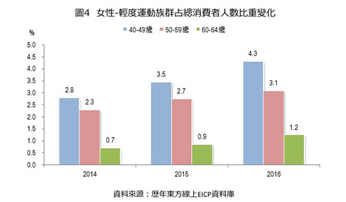 觀察族群特徵,在輕度運動族群方面,性別上相對集中於女性,2016年女性在此族群的占比為53.5%,高於全體消費者之結構(50.9%)。年齡上,2016年40歲以上占比為51.4%,也高於全體消費者比率(47.9%),顯示逐年成長的輕度運動族群的年齡層也相對較高。前述數據顯示了逐年成長的輕度運動族群以女性,且為40歲以上的消費者為主,持續以每周小於一小時內的運動時間,訓練或是維持自己的體態。