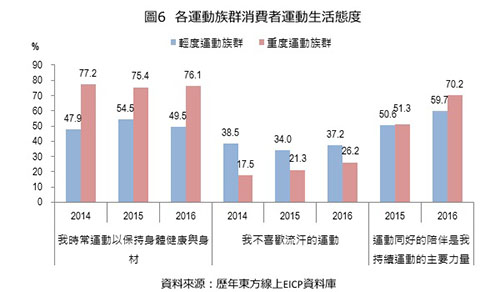 若進一步探究市場內部質變的動能,以兩族群的差異來看,可發現在「我不喜歡流汗的運動」上,輕度運動族群比率雖然較高,但沒有明顯的變動;相對的重度運動族群在「我不喜歡流汗的運動」項目同意比率卻持續上升 (17.5%--> 26.2%),顯示重度運動族群在運動之餘,也希望可以保有美觀、潔淨的需求。另一方面,「運動同好的陪伴是我持續運動的主要力量」在兩族群都呈現上升,表示運動群體化或社群化,也是未來的主要趨勢。