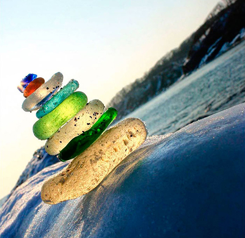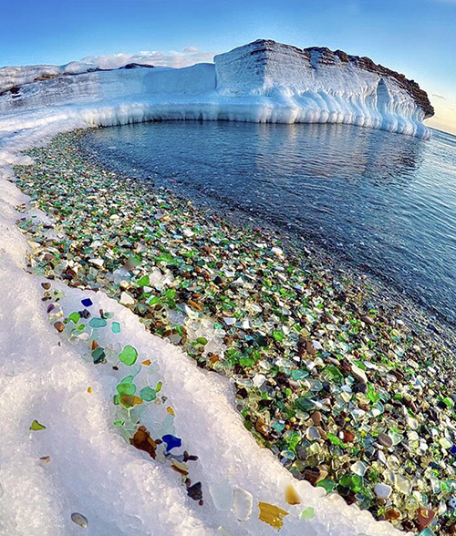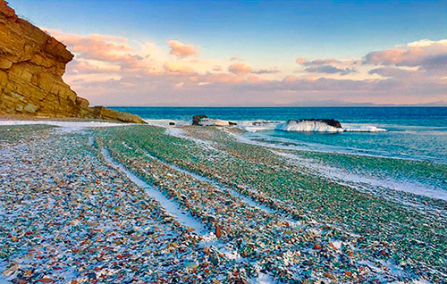 但數十年之後,海洋的潔淨力量,終將這些酒瓶沖上岸;只是,它們以閃耀的方式回歸了,它們變成一塊塊五顏六色的鵝卵石,布滿整片冰涼的海岸。當大自然以德報怨之後,人們回來了,烏蘇里灣變成旅遊景點,同時被列為特別保護區,現在有一個響亮的名字:Glass Beach(玻璃海濱)。