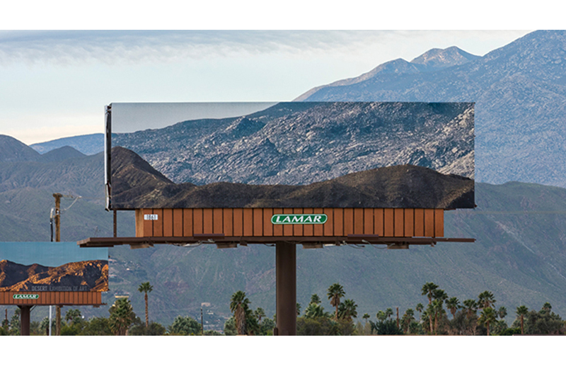 當你開車行駛於加州的 Gene Autry Trail,筆直的道路往往會讓駕駛人感到習慣與疲勞,甚至會產生遠方的山峰完全沒有變近的錯覺。為了喚醒大家的「能見距離」,不會以為公路怎麼沒盡頭,Jennifer Bolande 利用路旁的大型廣告看板,把周遭的遠近山巒複製貼上到看板上。