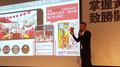 壹傳媒數位媒體業務部副總經理王志裕分享蘋果日報如何運用VR360技術並發送VR眼鏡,在大甲媽祖遶境期間,擴大內容影響力。(圖:DMA台北市數位行銷經營協會提供)
