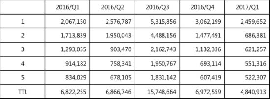 筆者依Youtube公佈的各季排行榜數字,摘出了2016/Q1到2017/Q1的各季數字,發現2017/Q1的排行榜瀏覽數,是歷年來最低,而前五名的瀏覽總數,更是首度低於500萬次(2015年各季前五名的總瀏覽次數均超過1,000萬次),這是否透露了什麼意義?筆者曾於去年第三季排行榜公佈時撰文「瀏覽率不等於銷售量」,說明瀏覽數雖然是一個指標,但並非衝高瀏覽數就是一支成功的影片,更重要的是想要藉影片達到什麼樣的行銷目的。
