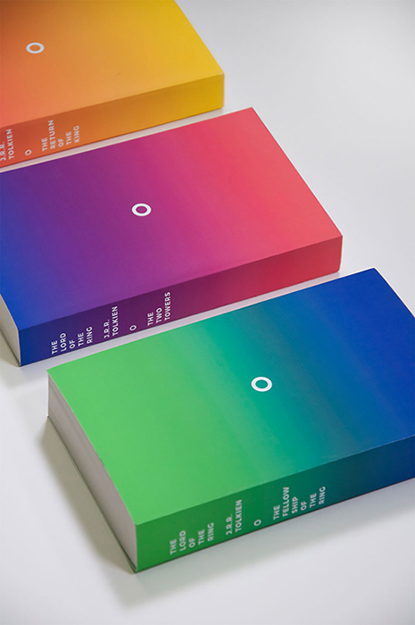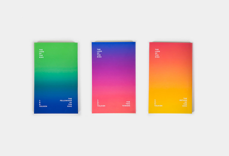 加拿大平面設計師 Matthieu Jeanson 決定將 J.R.R. 托爾金的史詩奇幻文學作品《魔戒》改頭換面,捨棄掉與主題有關的插畫,或是三部曲的電影圖像,秉持極簡和大膽的風格,整個封面只用鮮豔的漸層色彩去填滿,連每本書的標題跟作者名都變成封面上的配角。